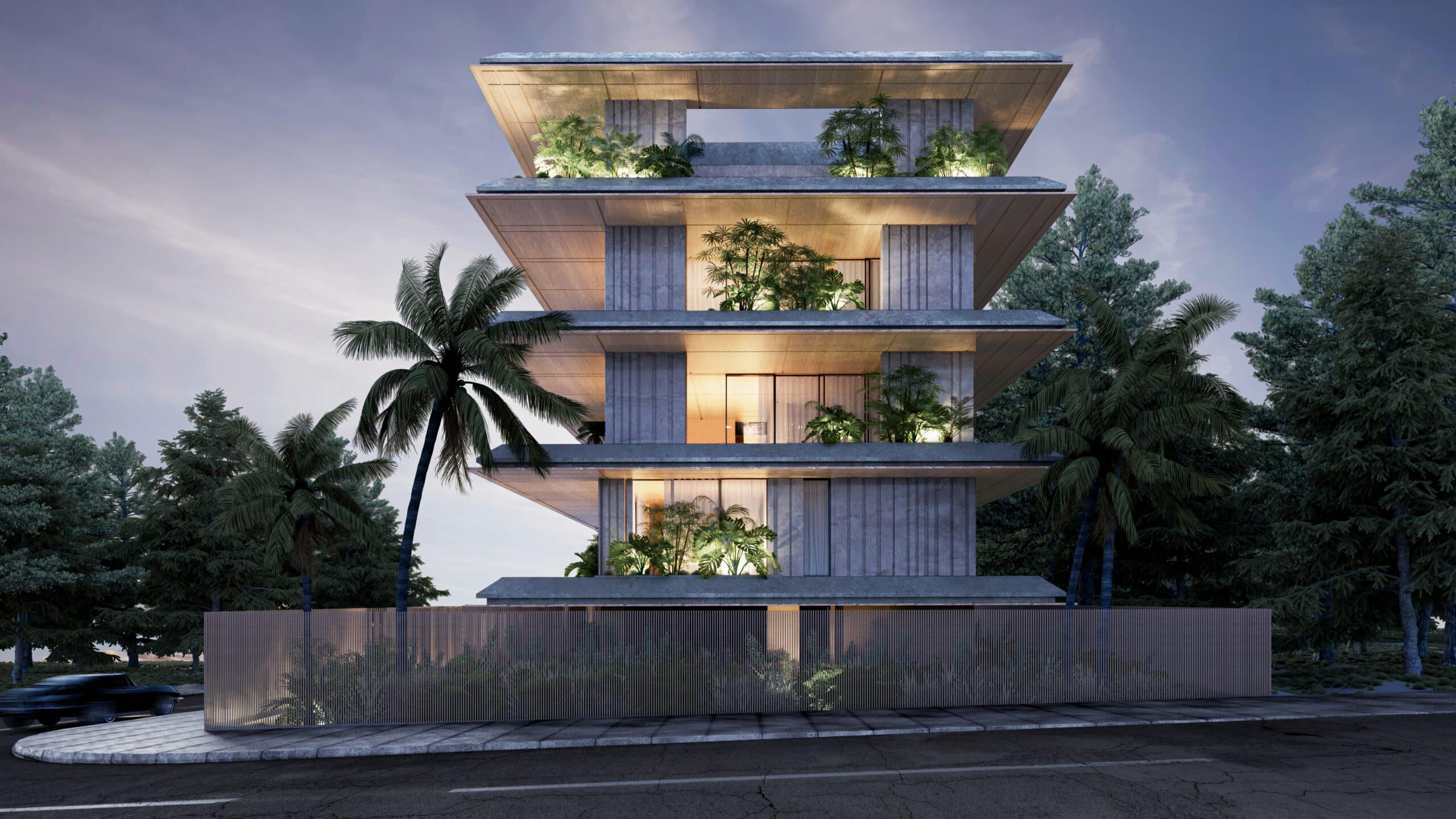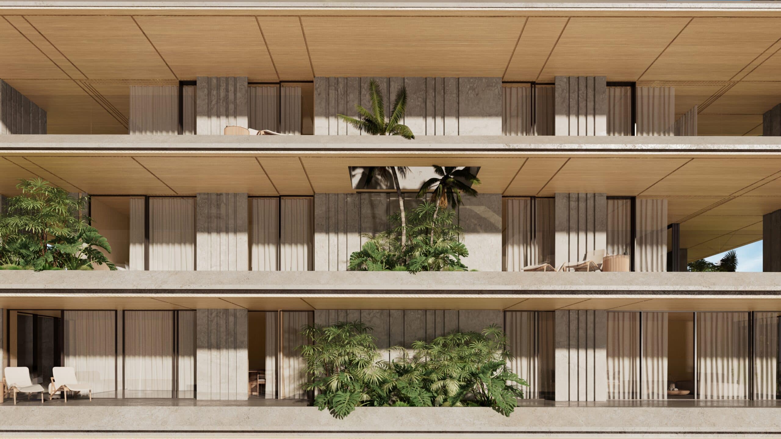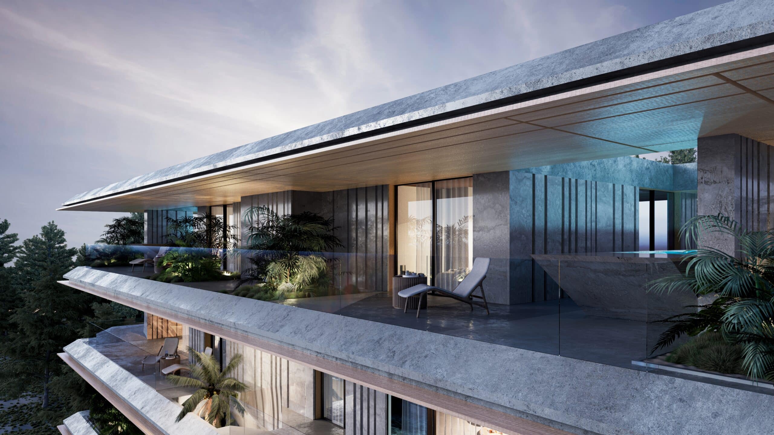 Rectangular slabs, sleek and thin, extend outward from the enclosed spaces towards the plot’s boundaries. The building’s volume recedes within its structure, creating dynamic forms and geometries that lend the impression of the building hovering visually. Facades are adorned with vertical wooden or marble elements, both fixed and movable, accentuating the clean lines and simplicity of the slabs.