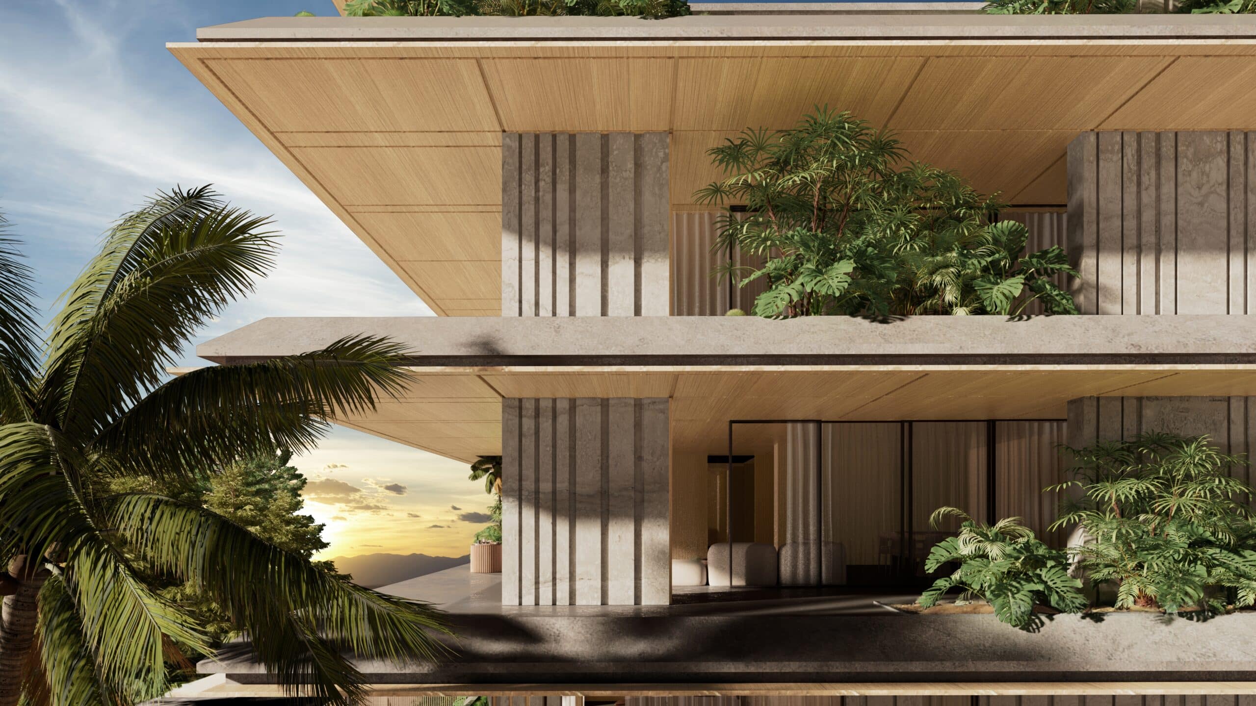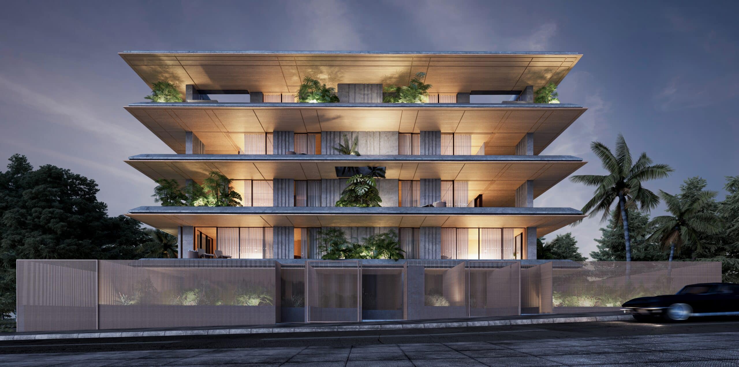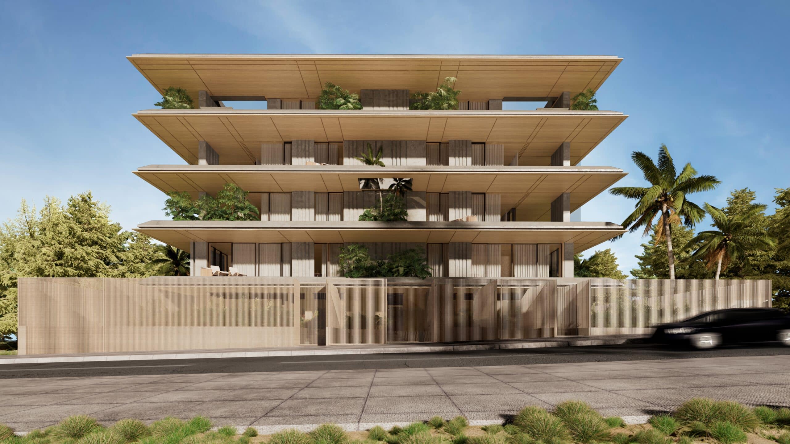 Rectangular slabs, sleek and thin, extend outward from the enclosed spaces towards the plot’s boundaries. The building’s volume recedes within its structure, creating dynamic forms and geometries that lend the impression of the building hovering visually. Facades are adorned with vertical wooden or marble elements, both fixed and movable, accentuating the clean lines and simplicity of the slabs.